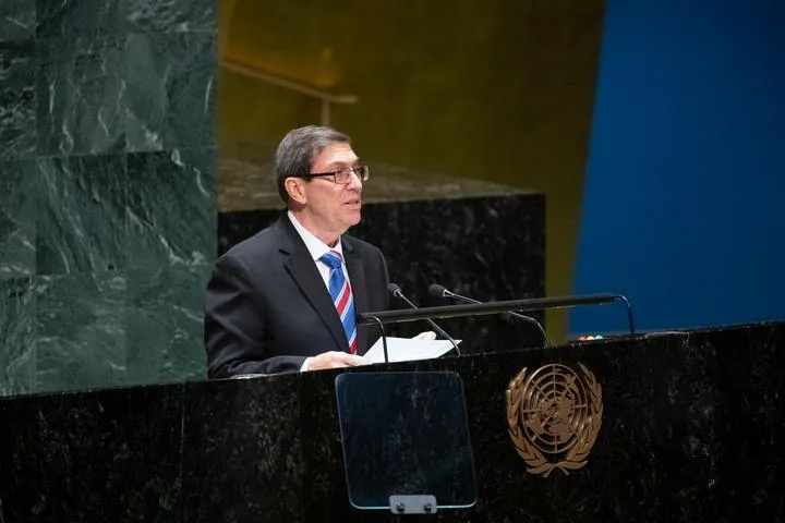 کیوبا کے وزیر خارجہ برونو روڈریگوز پیریلا اقوام متحدہ کے صدر دفتر میں کیوبا کے خلاف امریکہ کی اقتصادی اور تجارتی پابندیوں کے خلاف رائے شماری سے قبل خطاب کر رہے ہیں۔(شِنہوا)