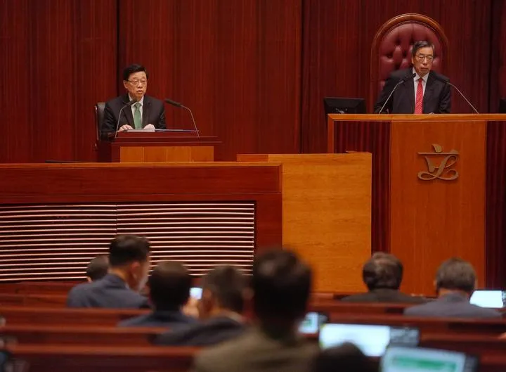 چین کے ہانگ کانگ خصوصی انتظامی علاقے (ایچ کے ایس اے آر) کے چیف ایگزیکٹیو جان لی (بائیں جانب آگے)چین کے جنوبی ہانگ کانگ میں ایچ کے ایس اے آر قانون ساز کونسل (لیگکو) سے اپنا دوسرا پالیسی خطاب کر رہے ہیں۔(شِنہوا)