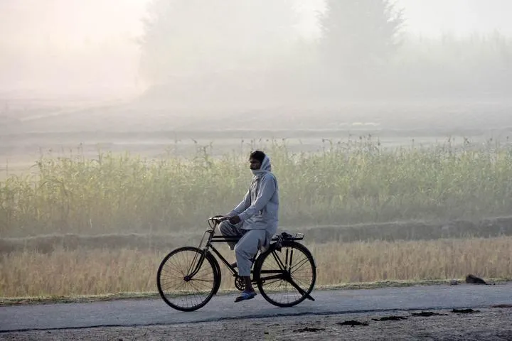لاہورکےمضافات میں سموگ کے دوران ایک شخص سڑک پر سائیکل چلا رہا ہے۔(شِنہوا)