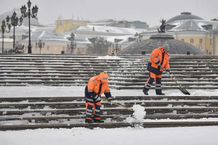 روس کے شہر ماسکومیں صفائی عملے کے کارکن برف صاف کر رہے ہیں۔(شِنہوا)