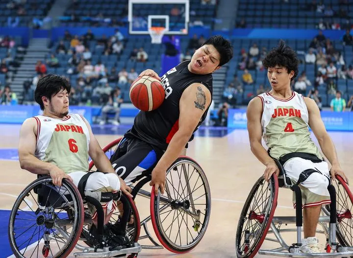 چین کےصوبہ ژی جیانگ کے شہرہانگ ژو میں جاپان اور جنوبی کوریا کے درمیان مردوں کے وہیل چیئر باسکٹ بال کے گولڈ میڈل میچ کے دوران جنوبی کوریا کےجم ڈونگ یون (درمیان) مقابلہ کر رہے ہیں۔(شِنہوا)