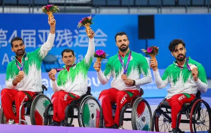 چین کے صوبہ ژی جیانگ کے شہر ہانگ ژو میں چوتھے ایشین پیرا گیمزمیں مردوں کے وہیل چیئر باسکٹ بال مقابلے کی ایوارڈ  تقریب کے دوران کانسی کا تمغہ جیتنے والے ایرانی کھلاڑی جشن منا رہے ہیں۔(شِنہوا)