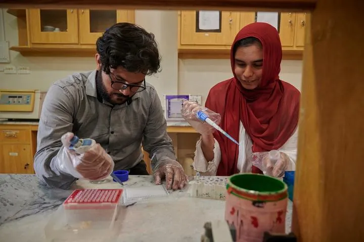پاکستانی طلباء قائداعظم یونیورسٹی میں چین-پاکستان جوائنٹ وہیٹ مالیکیولر بریڈنگ انٹرنیشنل لیب میں نمونوں کی جانچ کرتے ہوئے۔(شِنہوا)