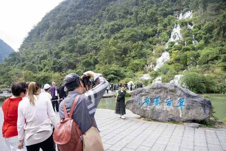 چین ، جنوب مغربی صوبے گوئی ژو میں سیاح کاؤنٹی لیبو کے خوبصورت مقام شیاؤ چھی کانگ کا دورہ کر رہے ہیں۔ (شِنہوا)