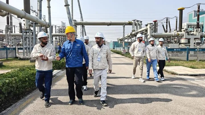 چین کے مشرقی صوبے شان ڈونگ کے شہر لین یی میں مٹیاری-لاہور ہائی وولٹیج ڈائریکٹ کرنٹ (ایچ وی ڈی سی) ٹرانسمیشن پروجیکٹ کے پاکستانی انجینئرز یی نان الٹرا ہائی وولٹیج کنورٹر اسٹیشن کا دورہ کررہے ہیں۔ (شِنہوا)