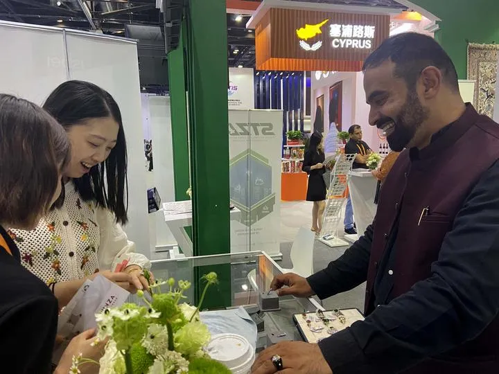 پاکستانی جوہری چوہدری سی آئی ایف ٹی آئی ایس 2023  میں اپنی کمپنی کی جیولری کی مصنوعات متعارف کروا رہے ہیں۔(شِنہوا)