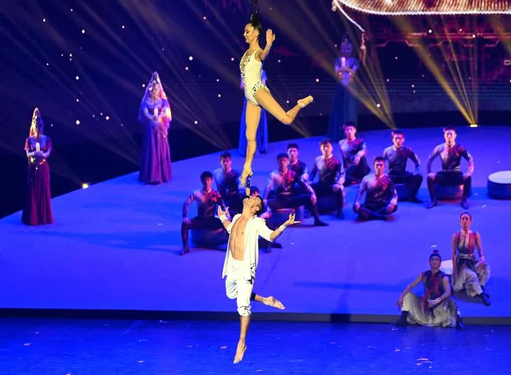چین ، شمالی صوبے ہیبے کے شہر شی جیا ژوآنگ میں منعقدہ 19 ویں چائنہ وو چھیاؤ بین الاقوامی سرکس میلے کی افتتاحی تقریب میں کرتب باز فن کا مظاہرہ کررہے ہیں۔ (شِںہوا)