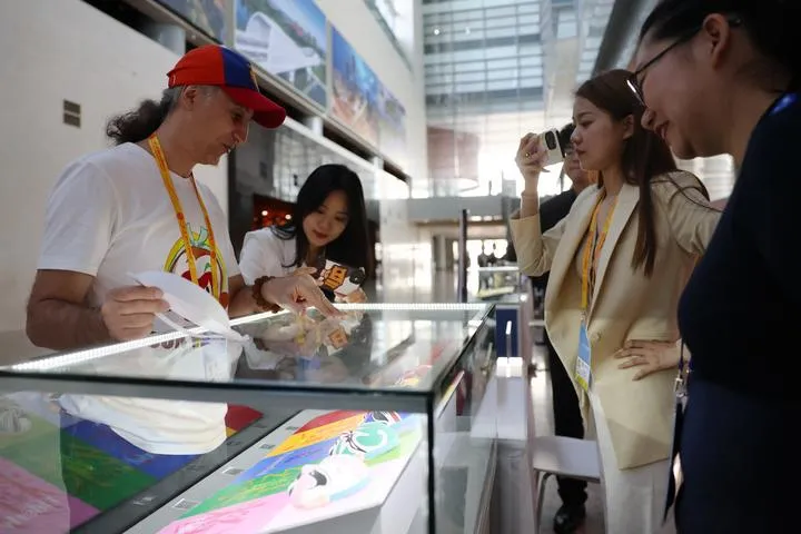 چین، دارالحکومت بیجنگ میں تیسرے بیلٹ اینڈ روڈ فورم برائے بین الاقوامی تعاون کے میڈیا مرکز میں صحافی غیرمادی چینی ثقافتی ورثہ کی نمائش دیکھ رہے ہیں۔ (شِںہوا)