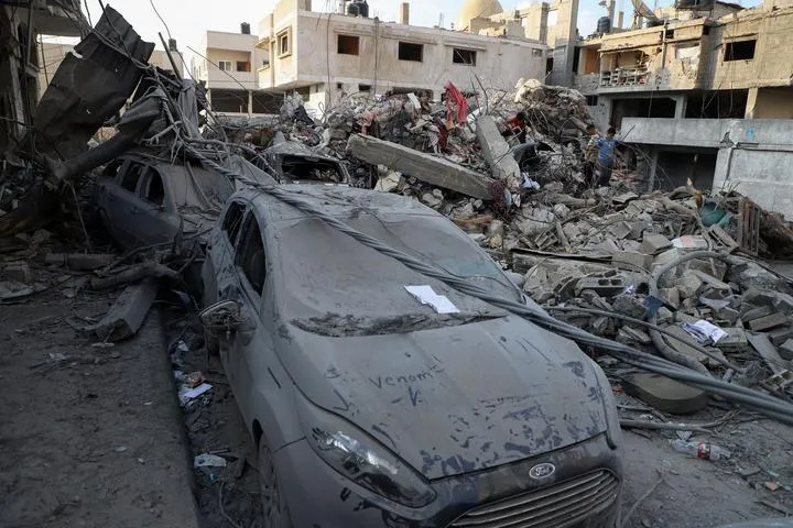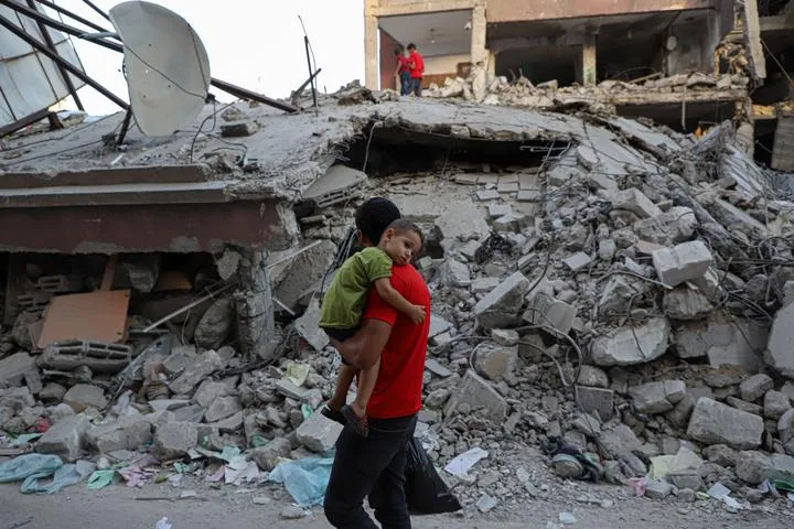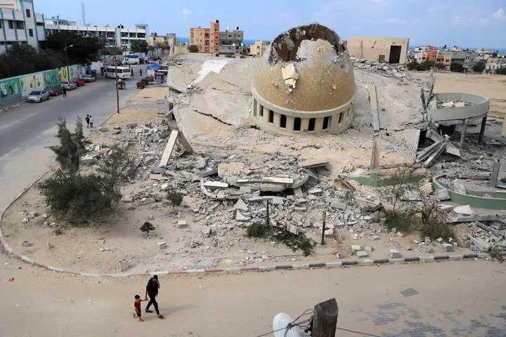 جنوبی غزہ کی پٹی کے شہر خان یونس میں اسرائیلی فضائی حملوں میں تباہ ہونے والی عمارت کے پاس سے لوگ گزر رہے ہیں۔(شِنہوا)