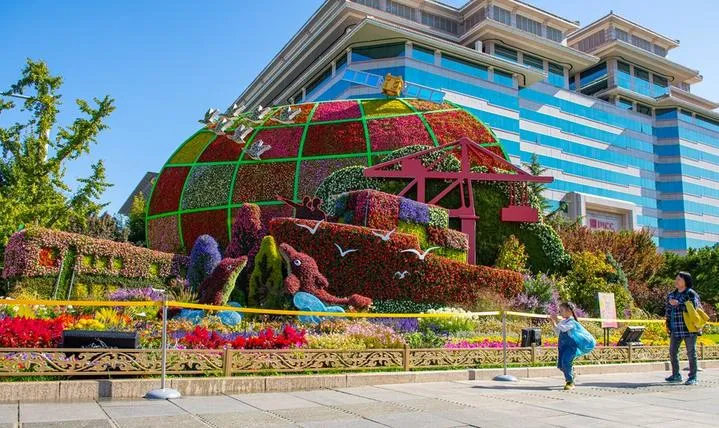 چین ، دارالحکومت بیجنگ میں چائنہ قومی کنونشن سینٹر کے قریب تیسرے بیلٹ اینڈ روڈ فورم برائے بین الاقوامی تعاون کے لئے پھولوں سے سجاوٹ کی گئی ہے۔ (شِنہوا)