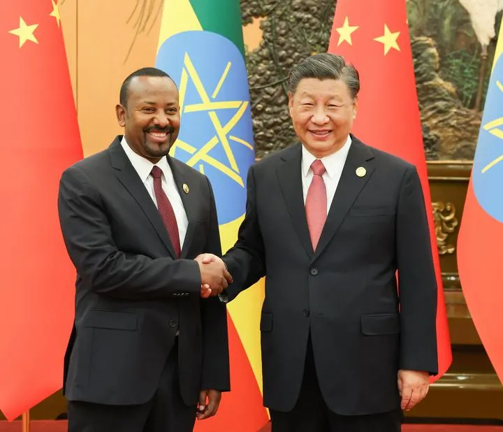 چین کے صدر شی جن پھنگ  بیجنگ میں ایتھوپیا کے وزیر اعظم ابی احمد سے عظیم عوامی ہال میں ملاقات کے دوران مصافحہ کر رہے ہیں۔(شِنہوا)