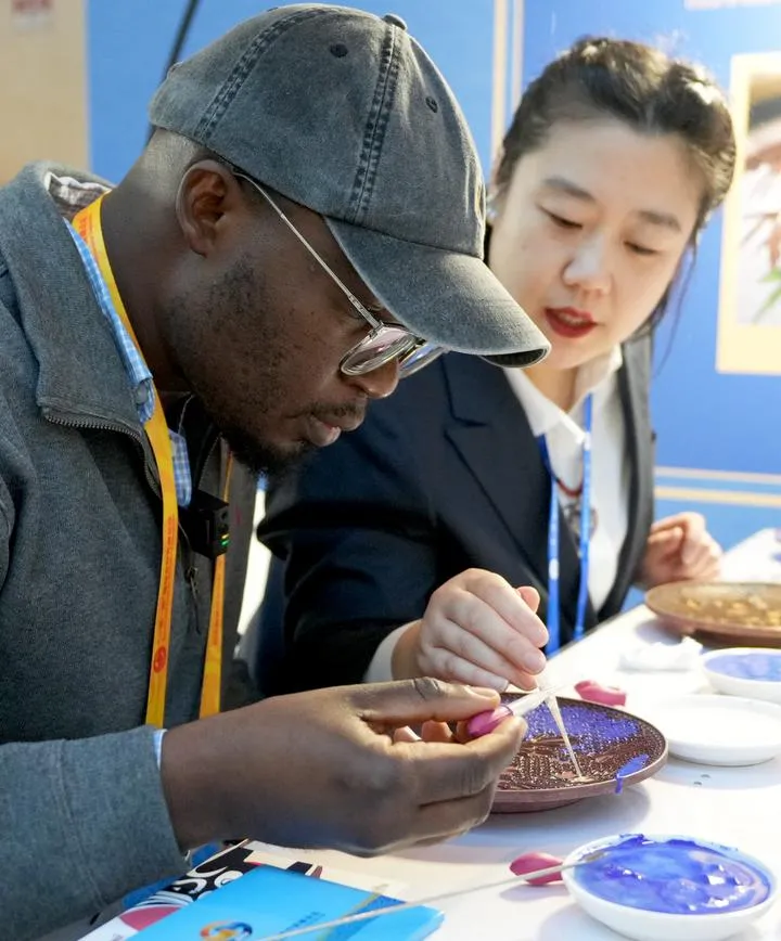 بیجنگ میں تیسرے بیلٹ اینڈ روڈ فورم برائے بین الاقوامی تعاون کے میڈیا سنٹر میں ایک غیر ملکی رپورٹر ثقافتی ورثہ انٹرایکٹو نمائش کے علاقے میں جِنگ تائی لان کلوئی سون بنانا سیکھ رہا ہے۔(شِنہوا)