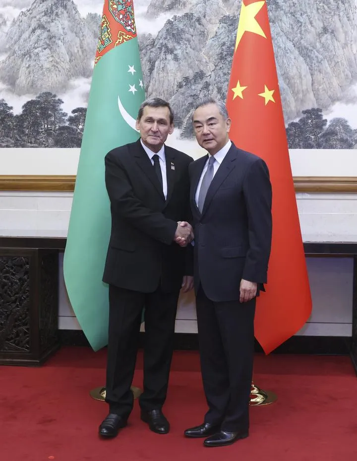 چینی وزیر خارجہ اور کمیونسٹ پارٹی آف چائنہ کی مرکزی کمیٹی کے سیاسی بیورو کے رکن وانگ یی بیجنگ میں دیاویوتائی سٹیٹ گیسٹ ہاؤس میں ترکمانستان کے نائب وزیر اعظم اور وزیر خارجہ راشد میردوف سے ملاقات کے دوران مصافحہ کر رہے ہیں۔(شِنہوا)
