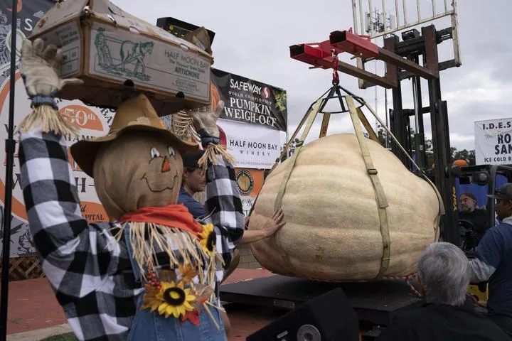 امریکہ کی ریاست کیلیفورنیا کی سین میٹیو کاؤنٹی کے  ہاف مون بے میں کدو کے وزن کے مقابلے کا منظر۔(شِنہوا)