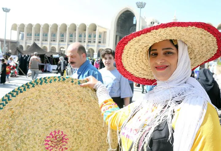 ایران، تہران میں ایک روایتی ثقافتی میلے کے دوران ایک خاتون بھوسے سے بنی ٹوپی دکھارہی ہے۔ (شِںہوا)