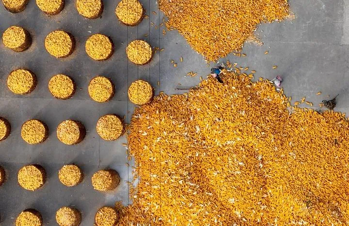 چین، شمالی صو بہ ہیبے کے شہر جن ژو کے دیہات ژو جیاژوآنگ میں کسان مکئی خشک کررہے ہیں۔ (شِنہوا)