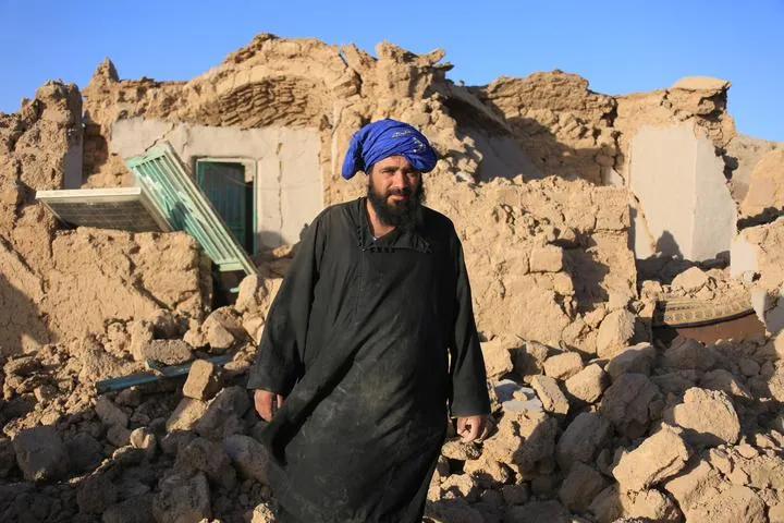 افغانستان ، صوبہ ہرات میں تباہ کن زلزلے کے بعد ایک شخص ملبے کا ڈھیر بن جانے والے مکانات کے سامنے کھڑا ہے۔ (شِنہوا)