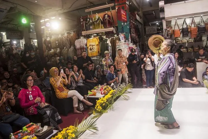 انڈونیشیا، یوگیاکارتا میں برنگ ہارجو مارکیٹ میں برنگ ہارجو فیشن ڈے میں ایک تاجرشرکت کر رہی ہے۔ (شِنہوا)