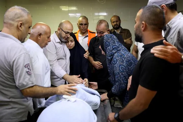 مغربی کنارے کے شہر نابلس کے ایک اسپتال میں لوگ لبیب الدمری کی میت کے گردسوگوارہیں۔(شِنہوا)
