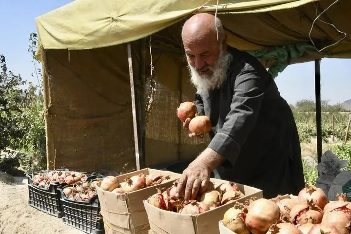 افغانستان ، صوبہ قندھار میں ایک افغان کسان ایک باغ میں تازہ انار دکھا رہا ہے۔ (شِنہوا)