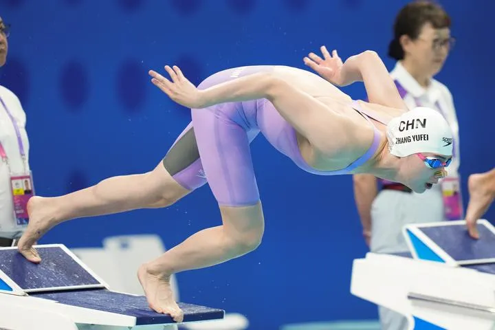 چین ، مشرقی صوبہ ژے جیانگ کے شہر ہانگ ژو میں جاری 19 ویں ایشیائی کھیلوں میں خواتین کی 50 میٹر فری اسٹائل ہیٹ آف سوئمنگ میں چین کی ژانگ یو فائی مقابلہ کر رہی ہیں۔ (شِنہوا)