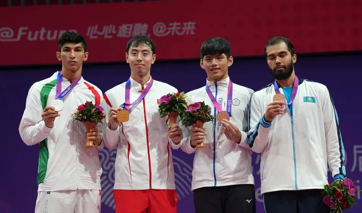19ویں ایشین گیمز میں تائیکوانڈو مردوں کے +80 کلوگرام مقابلے کی ایوارڈ تقریب میں سونے کا تمغہ جیتنے والے چین کے سونگ ژاؤشیانگ (بائیں سے دوسرے)، چاندی کا تمغہ جیتنے والے ایران کے آرین سلیمی (بائیں سے پہلے)، کانسی کا تمغہ جیتنےوالے چینی تائی پے کےلی مینگ این(دائیں سے دوسرے) اورقازقستان کے سمائیل ڈوئسبے اپنے تمغوں کے ساتھ کھڑے ہیں۔(شِنہوا)
