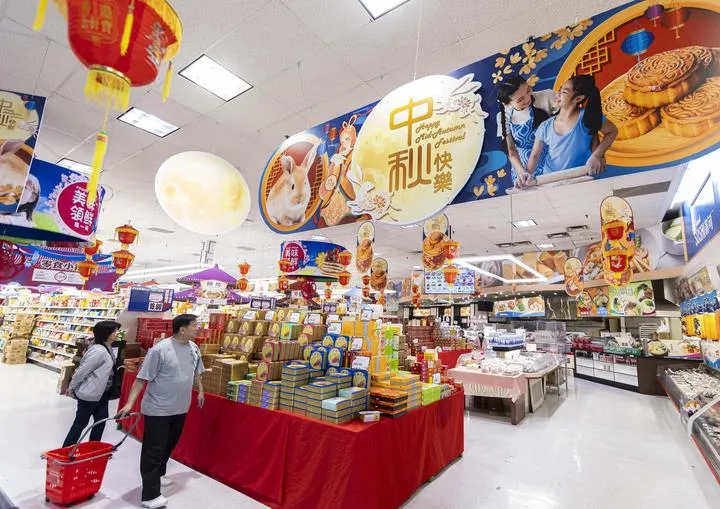 کینیڈا،  ٹورنٹو میں وسط خزاں تہوار سے قبل ایک سپرمارکیٹ میں صارفین مون کیک کے قریب سے گزر رہے ہیں۔ (شِںہوا)