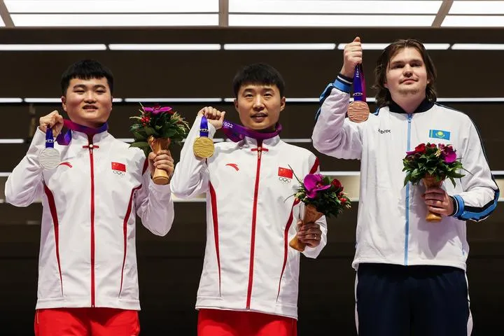 چین کے مشرقی صوبہ ژے جیانگ کے شہر ہانگ ژومیں 19ویں ایشین گیمز میں مردوں کے نشانہ بازی کے 25 میٹر ریپڈ فائر پسٹل فائنل میں سونے کا تمغہ جیتنے والے چینی کھلاڑی لی یوئی ہونگ (درمیان) چاندی کا تمغہ جیتنے والے لیو یانگ پان ( بائیں) اور قازقستان کے کانسی کا تمغہ جیتنے والے نکیتا چیری یوکن ایوارڈ تقریب میں شریک ہیں۔(شِںہوا)