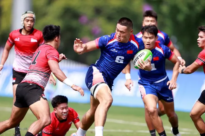 چین کے مشرقی صوبہ ژے جیانگ کے شہر ہانگ ژومیں 19ویں ایشین گیمز میں چین اورسنگاپور کے درمیان رگبی سیونز کے مردوں کے کوارٹر فائنل کے دوران چین کے کھلاڑی مقابلہ کر رہے ہیں۔(شِںہوا)