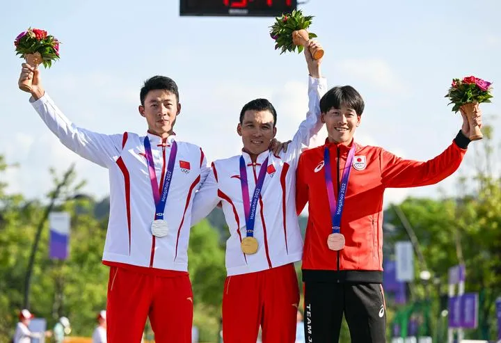 چین کے مشرقی صوبہ ژے جیانگ کے شہر ہانگ ژومیں 19ویں ایشین گیمز میں مردوں کی سائیکلنگ ماؤنٹین بائیک کراس کنٹری اولمپک میں سونے کا تمغہ جیتنے والے چینی کھلاڑی  می جیو جیانگ(درمیان)کانسی کا تمغہ جیتنے والےیوان جن وی(بائیں) اورکانسی کا تمغہ جیتنے والے جاپانی کھلاڑی سوادہ ٹوکی ایوارڈ تقریب میں شریک ہیں۔(شِںہوا)