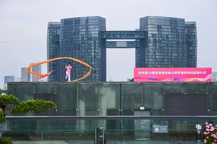 چین ، مشرقی صوبے ژے جیانگ کے صدرمقام ہانگ ژو میں 19 ویں ایشیائی کھیلوں کی مشعل ریلے کے دوران ایک فنکار فن کا مظاہرہ کر رہا ہے ۔ (شِنہوا)