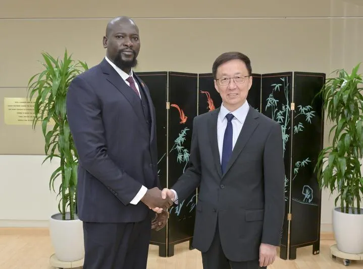 چین کے نائب صدر ہان ژینگ امریکہ کے شہر نیویارک میں اقوام متحدہ کی جنرل اسمبلی کے موقع پر گنی کے عبوری صدر ماماڈے ڈومبویا سے ملاقات کے دوران مصافحہ کر رہے ہیں۔(شِنہوا)