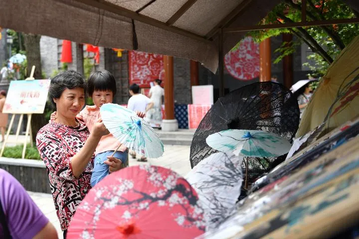 چین ، وسطی صوبہ ہونان کے شہر چھن ژو کے ضلع سوشیان کے قصبے اسکرول میں منعقدہ غیرمادی ثقافتی نمائش میں لوگ خریداری کررہے ہیں۔ (شِنہوا)
