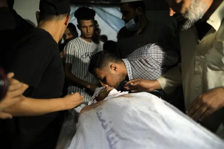 اسرائیل کے ساتھ جھڑپوں کے دوران جاں بحق ہونے والے فلسطینی نوجوان یوسف رضوان کی میت پرلوگ جنوبی غزہ کی پٹی کے شہر خان یونس کے ایک اسپتال میں غم زدہ ہیں۔(شِنہوا)