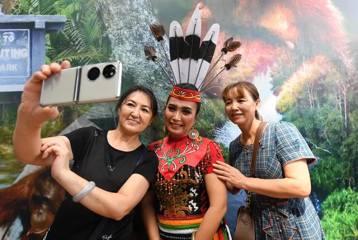 چین، جنوبی گوانگ شی ژو آنگ خوداختیار خطے کے صدر مقام نان ننگ کے بین الاقوامی کنونشن اور نمائش مرکز میں 20 ویں چین-آسیان نمائش کے دوران خواتین ایک انڈونیشین اداکارہ (درمیان) کے ساتھ سیلفی بنارہی ہیں۔ (شِنہوا)