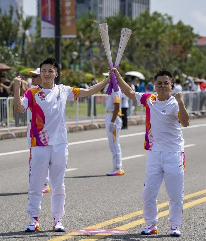 چین ، مشرقی صوبے ژے جیانگ کے شہر ژوشان میں 19 ویں ایشیائی کھیلوں کی مشعل ریلے میں مشعل بردار شو دی یانگ (دائیں) اور چھن یی بے کا تصاویر کے لئے ایک انداز ۔(شِنہوا)