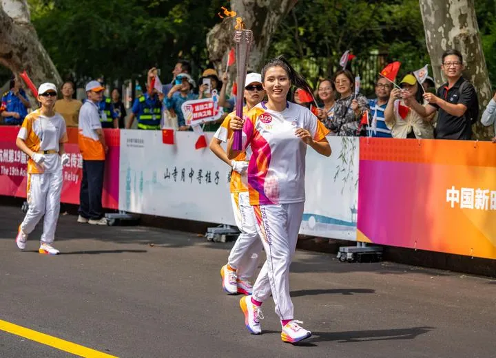 چین ، مشرقی صوبے ژے جیانگ کے شہر ژوشان میں 19 ویں ایشیائی کھیلوں کی مشعل ریلے میں مشعل بردار ڈینگ شو مشعل لیکر دوڑرہے ہیں۔ (شِنہوا)