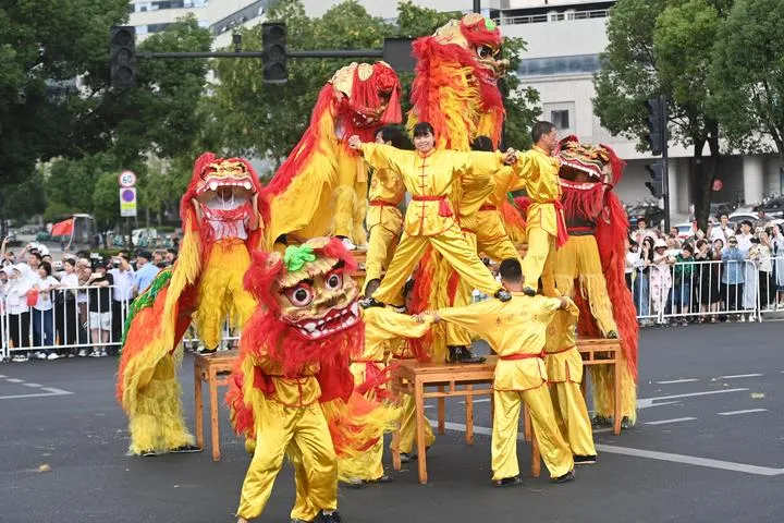 چین ، مشرقی صوبے ژے جیانگ کے شہر تائی ژو میں 19 ویں ایشیائی کھیلوں کی مشعل ریلے کے دوران فنکار شیر رقص پیش کررہے ہیں۔ (شِنہوا)