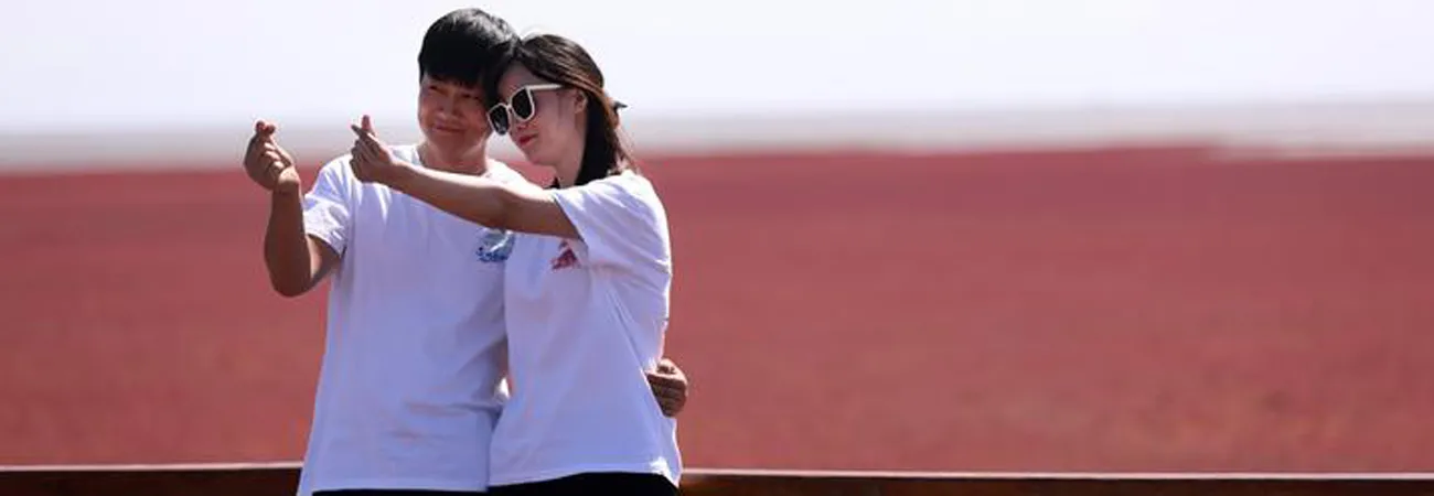 چین ، شمال مشرقی صوبہ لیاؤننگ کے شہر پان جن میں ہانگ ہائی تان سرخ ساحل پر سیاحوں کا  تصاویر کے لئے انداز ۔(شِنہوا)
