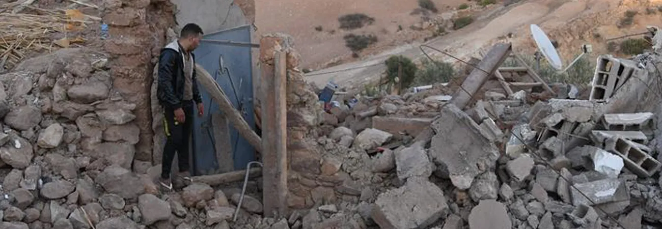 مراکش کے شہر تہناؤٹ میں آنے والے شدید زلزلے کے بعد ایک شخص تباہ شدہ عمارت کے ملبے کے درمیان سے گزر رہا ہے۔(شِنہوا)