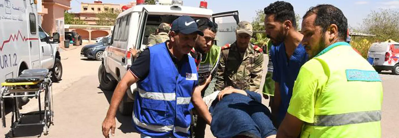 مراکش کےشہر أزرومیں آنےوالےشدید زلزلےکےمرکزکےقریب امدادی کارکن ایک زخمی کو ایمبولینس میں لے جا رہے ہیں۔(شِنہوا)