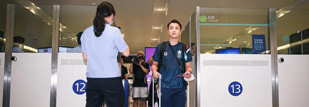 چین ، ہانگ ژو میں آمدہ 19 ویں ایشیائی کھیلوں میں شرکت کے لئے شیاؤ شان بین الاقوامی ہوائی اڈے پر پہنچنے والے چین کے ہانگ کانگ کے دستہ کے ایک رکن کو دیکھا جاسکتا ہے۔ (شِنہوا)