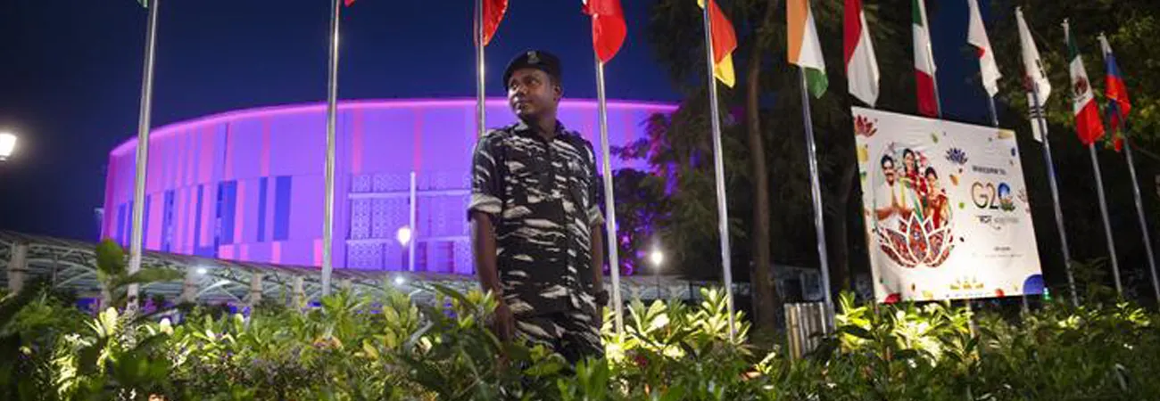 بھارت کے شہرنئی دہلی میں گروپ آف 20 (جی 20) سربراہ اجلاس کےلوگو کے قریب ایک بھارتی نیم فوجی دستے کا اہلکار پہرہ دے رہا ہے۔(شِنہوا)
