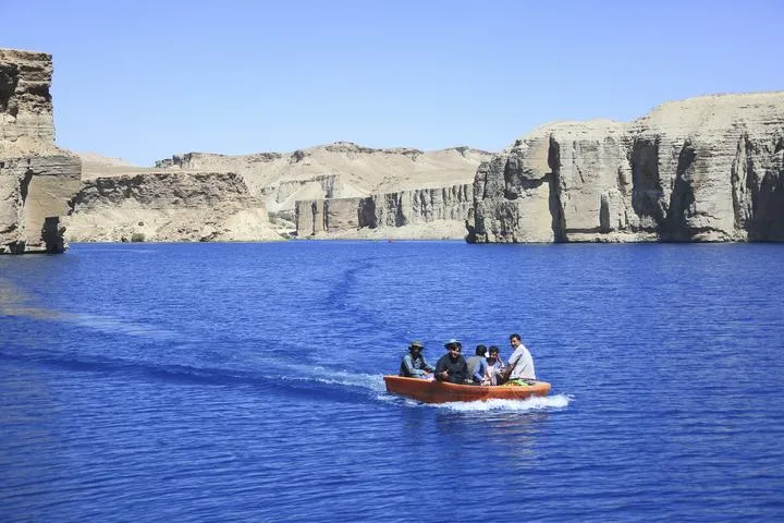 افغانستان کے صوبہ بامیان کی بندِامیرجھیل میں سیاح کشتی پر سوار ہیں۔(شِنہوا)
