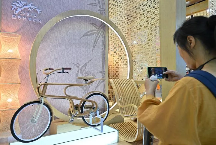 چین، دارالحکومت بیجنگ میں منعقدہ 2023 چائنہ بین الاقوامی نمائش برائے تجارتی خدمات کے دوران ماحولیاتی خدمات کی نمائش میں ایک خاتون بانس سے بنی بائی سائیکل کی تصاویر بنارہی ہے۔(شِنہوا)