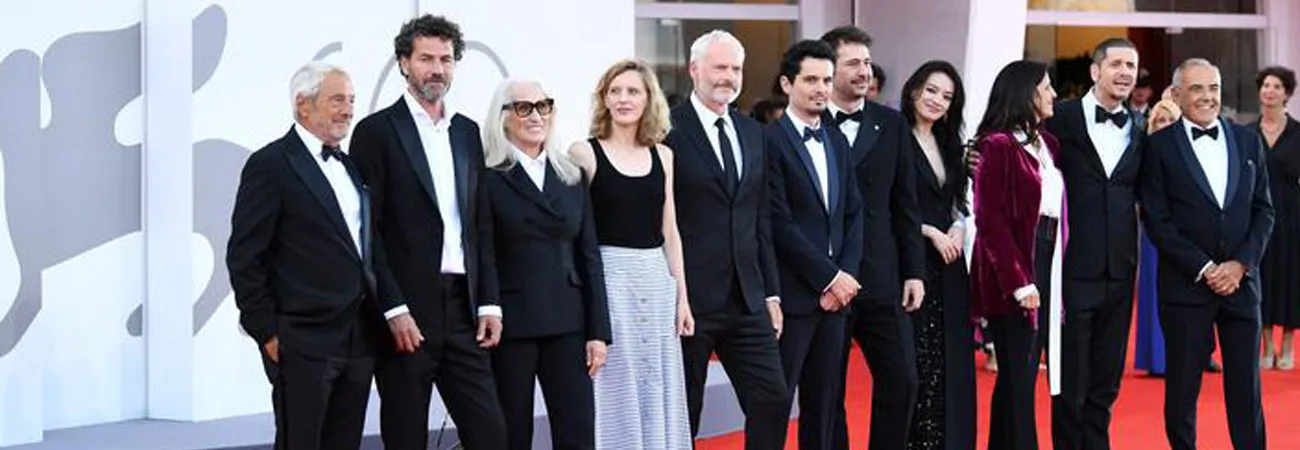 اٹلی، وینس میں منعقدہ  80 ویں وینس بین الاقوامی فلم میلے کے ریڈ کارپٹ پر جیوری ارکان کا وینس فلم میلے کے ڈائریکٹر البرٹو باربیرا (پہلے دائیں) اور بائینلے صدر رابرٹو سیکٹو (پہلے بائیں) کے ساتھ تصاویر کے لئے انداز۔ (شِنہوا)