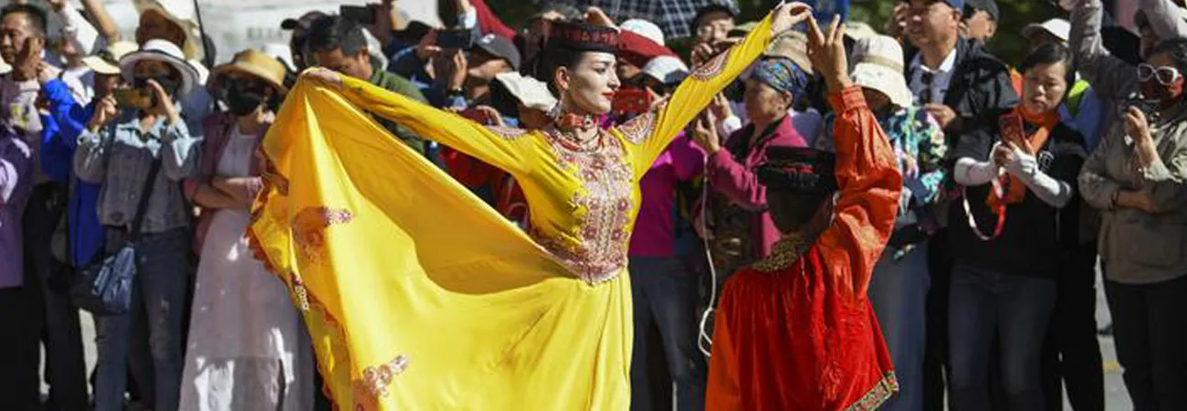 چین کے شمال مغربی سنکیانگ ویغورخودمختارعلاقےکی تاشکورگن تاجک خود مختار کاؤنٹی میں سیاحوں کے خیر مقدم کے لیے فنکار رقص کر رہے ہیں۔(شِنہوا)