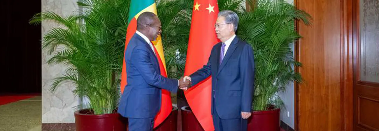 چین کی نیشنل پیپلز کانگریس کی قائمہ کمیٹی کے چیئرمین ژاؤ لیجی بیجنگ میں جمہوریہ بینن کے صدر پیٹریس ایتھناس گیلوم ٹیلون سے ملاقات کے دوران مصافحہ کررہے ہیں۔(شِنہوا)