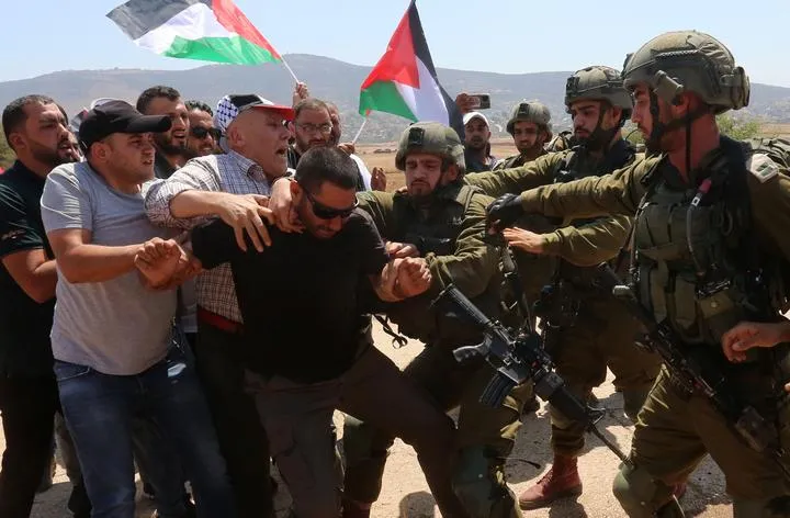 نابلس کے مشرق میں مغربی کنارے کے گاؤں بیت دجان میں یہودی بستیوں کی توسیع کے خلاف احتجاج کے دوران فلسطینی مظاہرین کی اسرائیلی فوجیوں سے جھڑپوں کا منظر۔(شِنہوا)