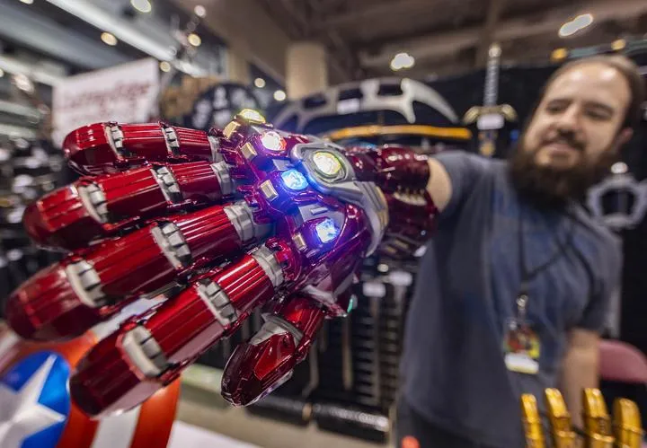 کینیڈاکے شہر ٹورنٹو میں 2023 فین ایکسپو کینیڈا کے دوران ایک نمائش کنندہ ایک آئرن مین انفینٹی گانٹلیٹ دکھا رہا ہے۔(شِنہوا)